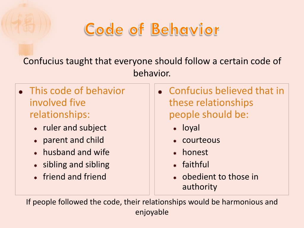 Code of Behavior • This code of behavior involved five relationships: • ruler and subject • parent and child • husband and wife • sibling and sibling • friend and friend • Confucius believed that in these relationships people should be: • loyal • courteous • honest • faithful • obedient to those in authority Confucius taught that everyone should follow a certain code of behavior. If people followed the code, their relationships would be harmonious and enjoyable