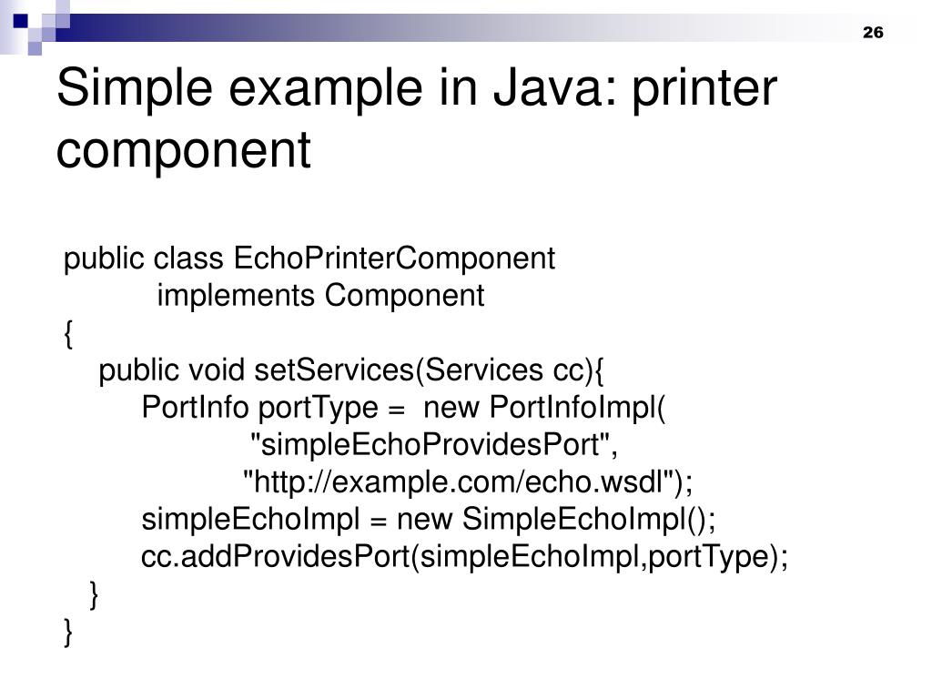 Simple example in Java: printer component public class EchoPrinterComponent implements Component { public void setServices(Services cc){ PortInfo portType = new PortInfoImpl( "simpleEchoProvidesPort", "http://example.com/echo.wsdl"); simpleEchoImpl = new SimpleEchoImpl(); cc.addProvidesPort(simpleEchoImpl,portType); } }