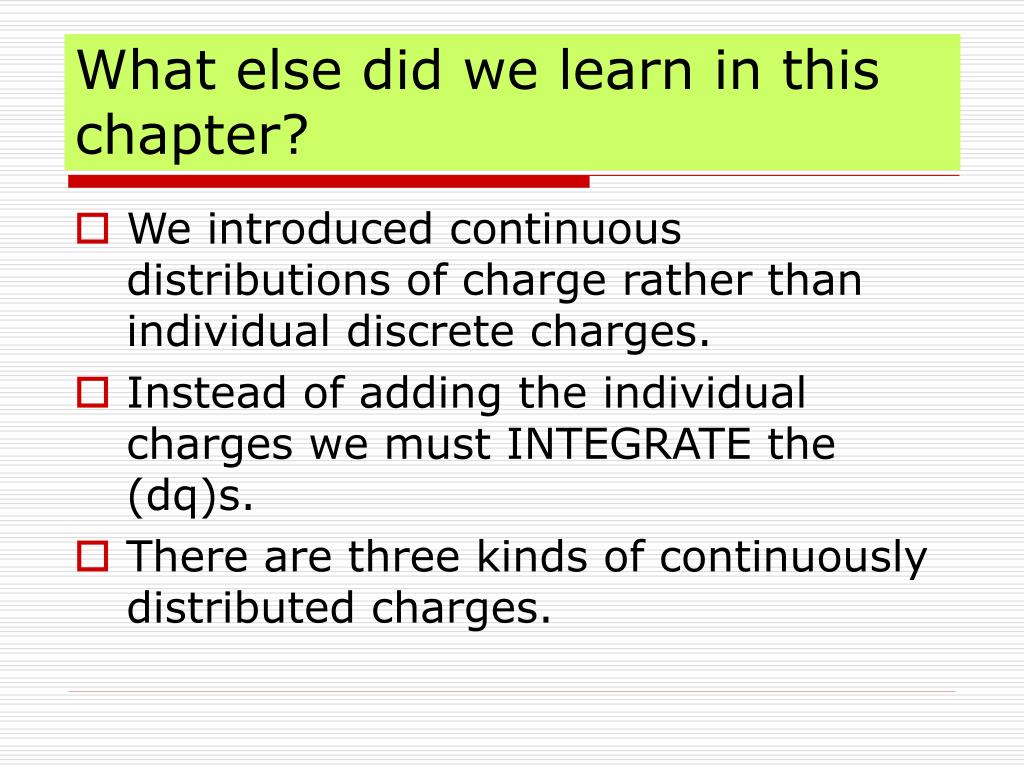 What else did we learn in this chapter? • We introduced continuous distributions of charge rather than individual discrete charges. • Instead of adding the individual charges we must INTEGRATE the (dq)s. • There are three kinds of continuously distributed charges.