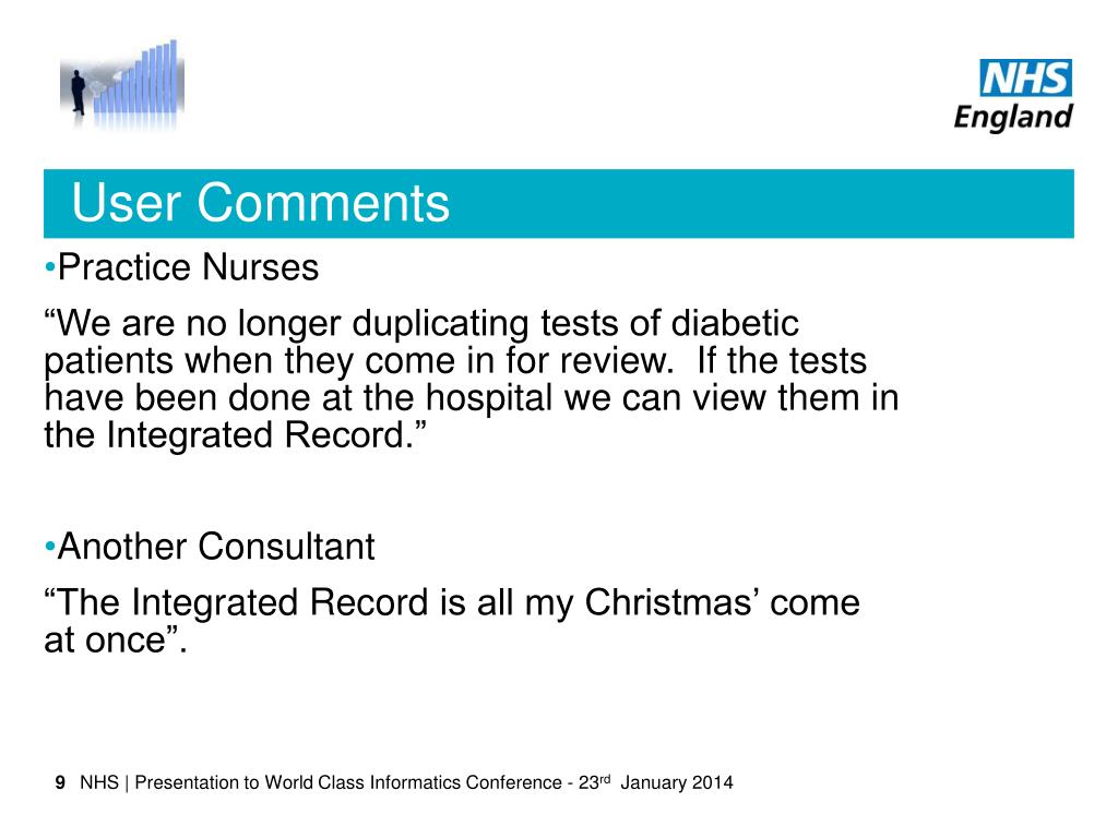User Comments • Practice Nurses “We are no longer duplicating tests of diabetic patients when they come in for review. If the tests have been done at the hospital we can view them in the Integrated Record.” • Another Consultant “The Integrated Recordis all my Christmas’ come at once”. NHS | Presentation to World Class Informatics Conference - 23rd January 2014