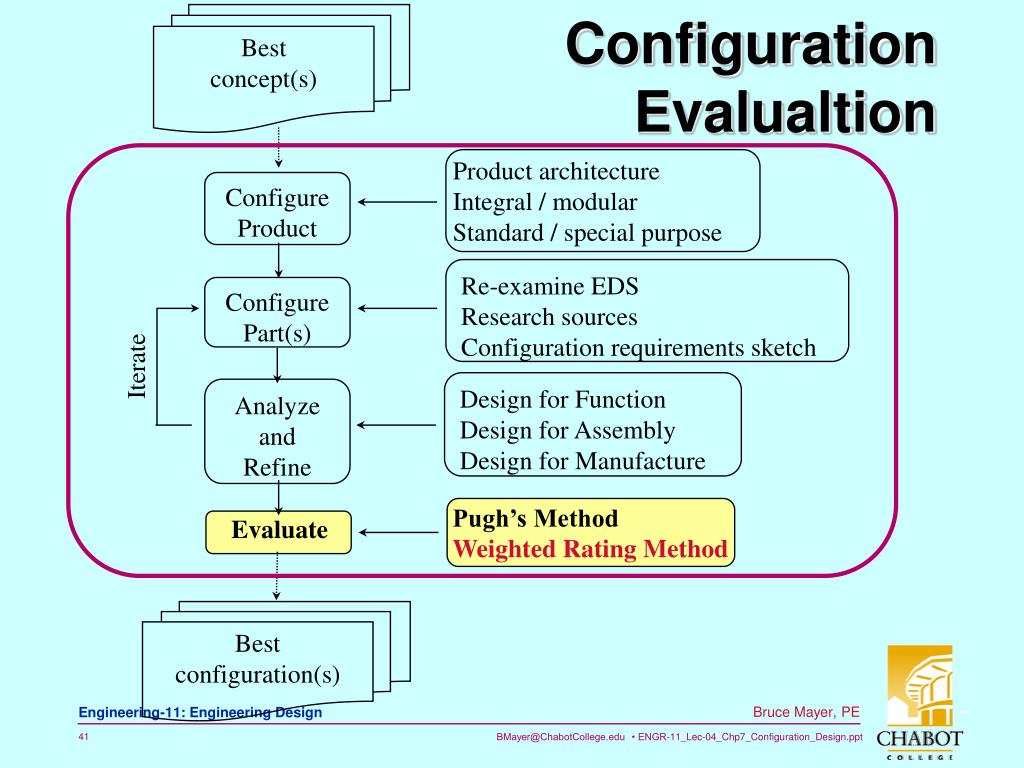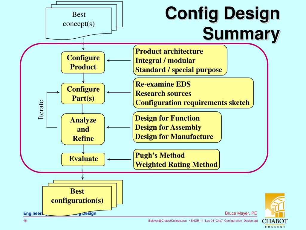 Best concept(s) Config DesignSummary Product architecture Integral / modular Standard / special purpose Configure Product Re-examine EDS Research sources Configuration requirements sketch Configure Part(s) Iterate Design for Function Design for Assembly Design for Manufacture Analyze and Refine Pugh’s Method Weighted Rating Method Evaluate Best configuration(s)