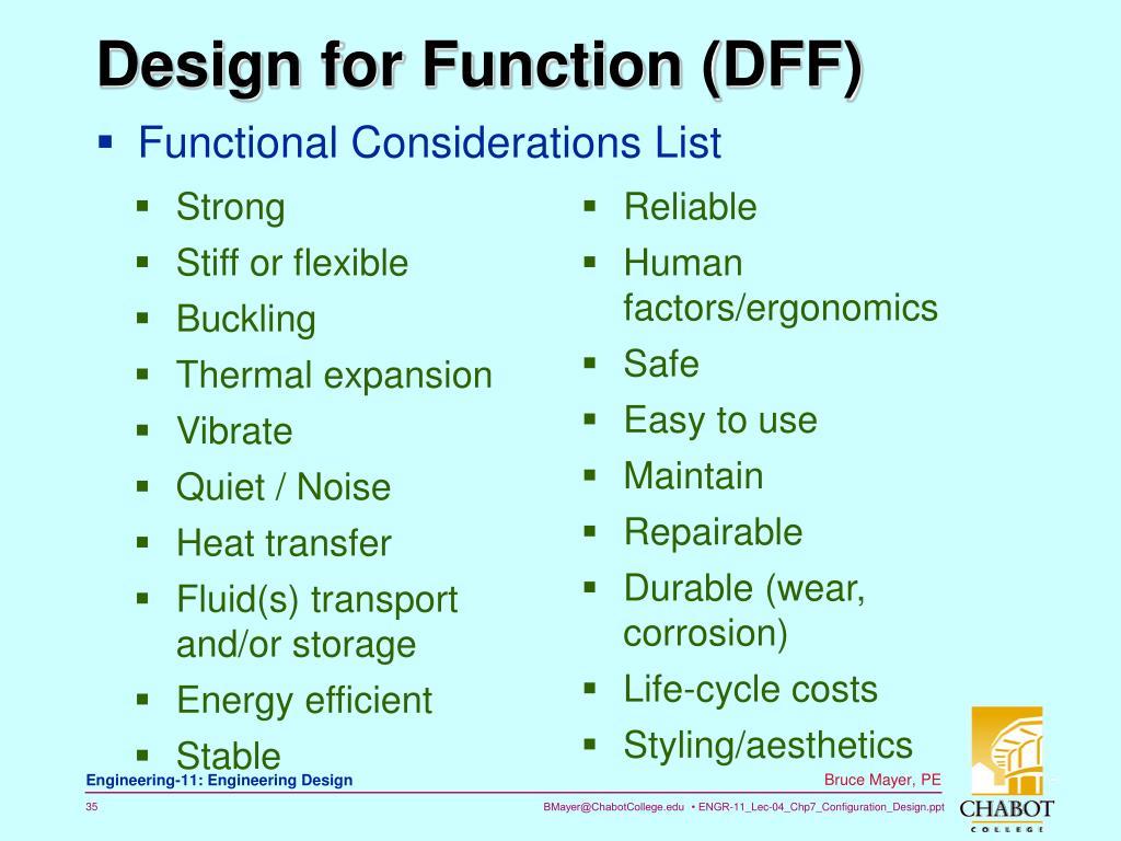 Design for Function (DFF) • Functional Considerations List • Strong • Stiff or flexible • Buckling • Thermal expansion • Vibrate • Quiet / Noise • Heat transfer • Fluid(s) transport and/or storage • Energy efficient • Stable • Reliable • Human factors/ergonomics • Safe • Easy to use • Maintain • Repairable • Durable (wear, corrosion) • Life-cycle costs • Styling/aesthetics