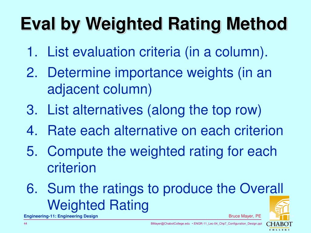 Eval by Weighted Rating Method • List evaluation criteria (in a column). • Determine importance weights (in an adjacent column) • List alternatives (along the top row) • Rate each alternative on each criterion • Compute the weighted rating for each criterion • Sum the ratings to produce the Overall Weighted Rating