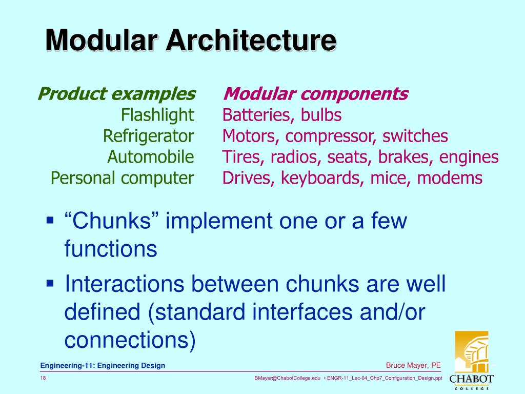 Modular Architecture • Product examples • Flashlight • Refrigerator • Automobile • Personal computer Modular components Batteries, bulbs Motors, compressor, switches Tires, radios, seats, brakes, engines Drives, keyboards, mice, modems • “Chunks” implement one or a few functions • Interactions between chunks are well defined (standard interfaces and/or connections)