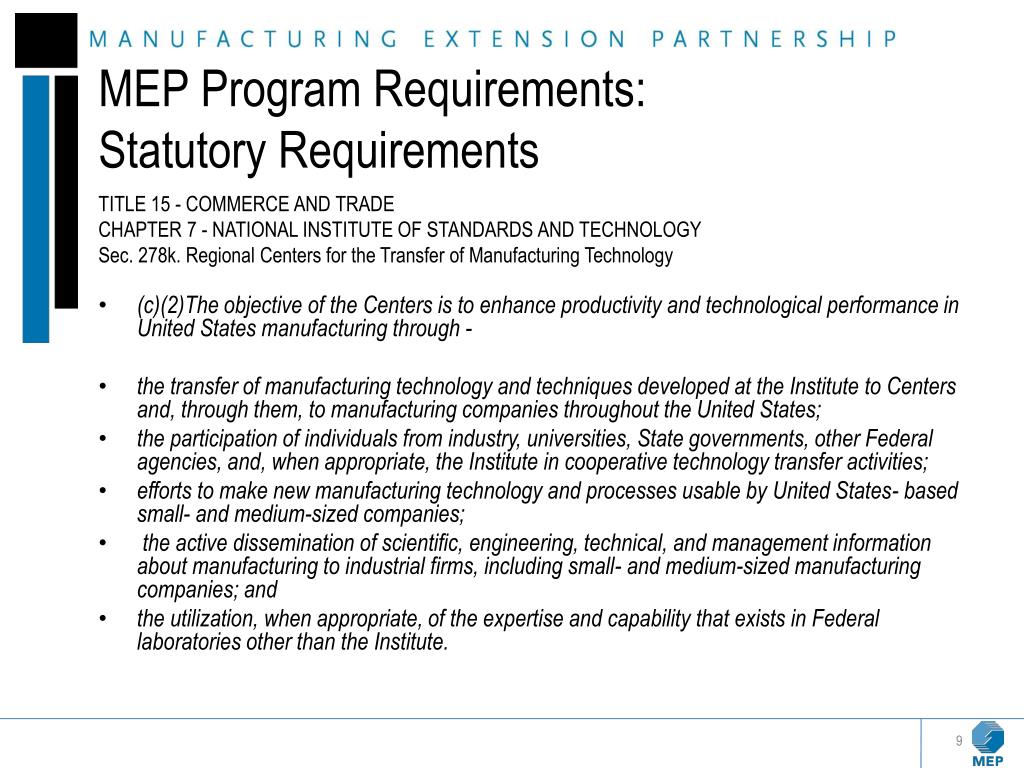 MEP Program Requirements:Statutory Requirements TITLE 15 - COMMERCE AND TRADE CHAPTER 7 - NATIONAL INSTITUTE OF STANDARDS AND TECHNOLOGY Sec. 278k. Regional Centers for the Transfer of Manufacturing Technology • (c)(2)The objective of the Centers is to enhance productivity and technological performance in United States manufacturing through - • the transfer of manufacturing technology and techniques developed at the Institute to Centers and, through them, to manufacturing companies throughout the United States; • the participation of individuals from industry, universities, State governments, other Federal agencies, and, when appropriate, the Institute in cooperative technology transfer activities; • efforts to make new manufacturing technology and processes usable by United States- based small- and medium-sized companies; • the active dissemination of scientific, engineering, technical, and management information about manufacturing to industrial firms, including small- and medium-sized manufacturing companies; and • the utilization, when appropriate, of the expertise and capability that exists in Federal laboratories other than the Institute.