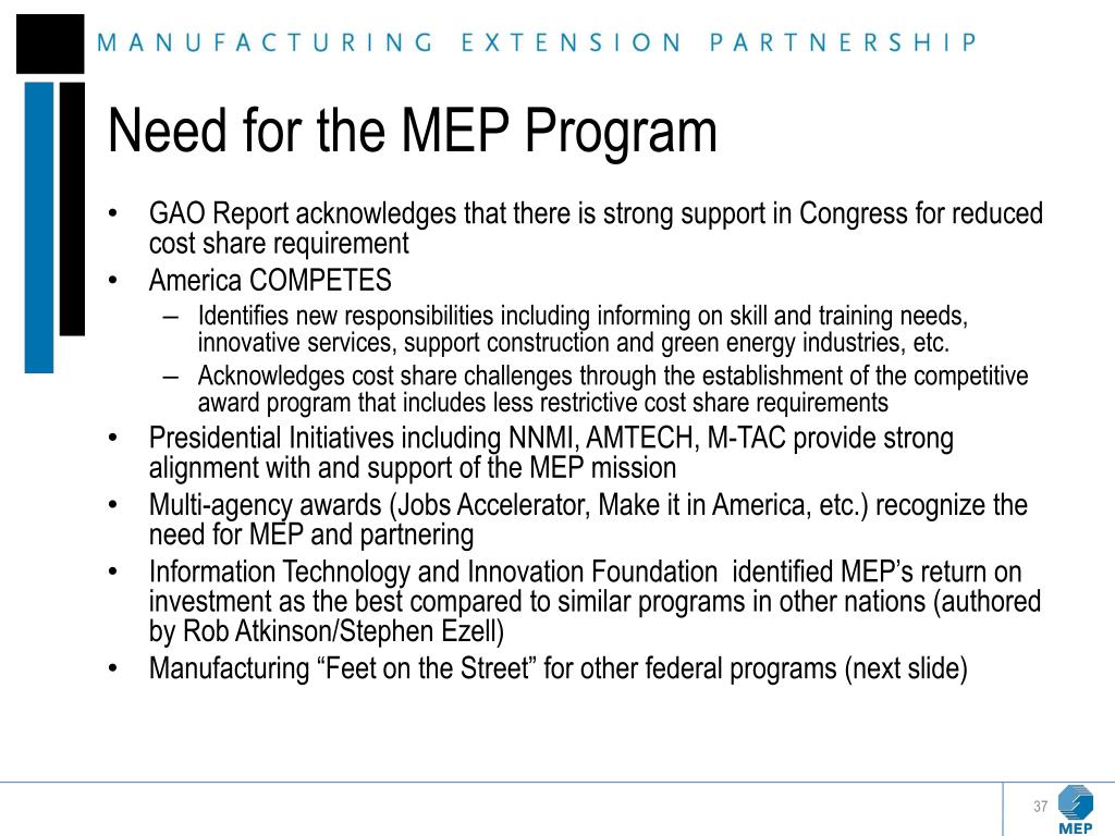 Need for the MEP Program • GAO Report acknowledges that there is strong support in Congress for reduced cost share requirement • America COMPETES • Identifies new responsibilities including informing on skill and training needs, innovative services, support construction and green energy industries, etc. • Acknowledges cost share challenges through the establishment of the competitive award program that includes less restrictive cost share requirements • Presidential Initiatives including NNMI, AMTECH, M-TAC provide strong alignment with and support of the MEP mission • Multi-agency awards (Jobs Accelerator, Make it in America, etc.) recognize the need for MEP and partnering • Information Technology and Innovation Foundation identified MEP’s return on investment as the best compared to similar programs in other nations (authored by Rob Atkinson/Stephen Ezell) • Manufacturing “Feet on the Street” for other federal programs (next slide)