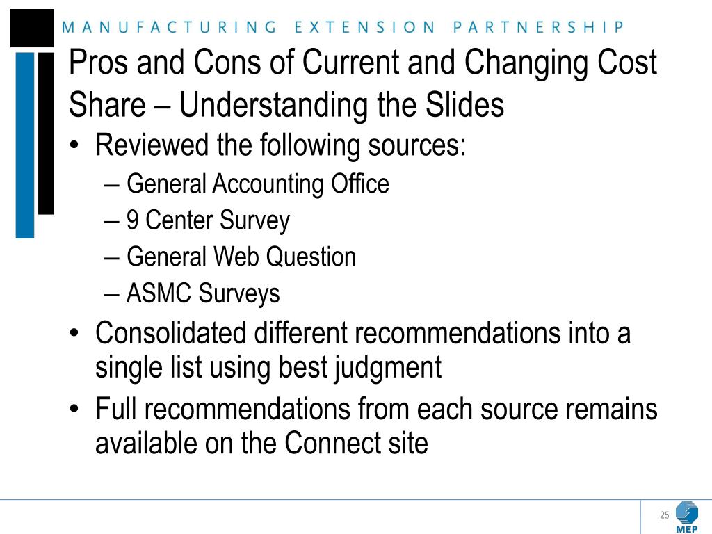 Pros of Changing Cost Share Enables centers to focus on delivering services to manufacturers Ensures that MEP services remain affordable for the nation’s small and mid-sized manufacturers Decreases the amount of time spent securing less valuable cost share Better serve the needs of regional stakeholders Better respond to the evolving needs of manufacturers Relieves administrative burden – centers could still maintain in-kind relationships but may not need to report them all