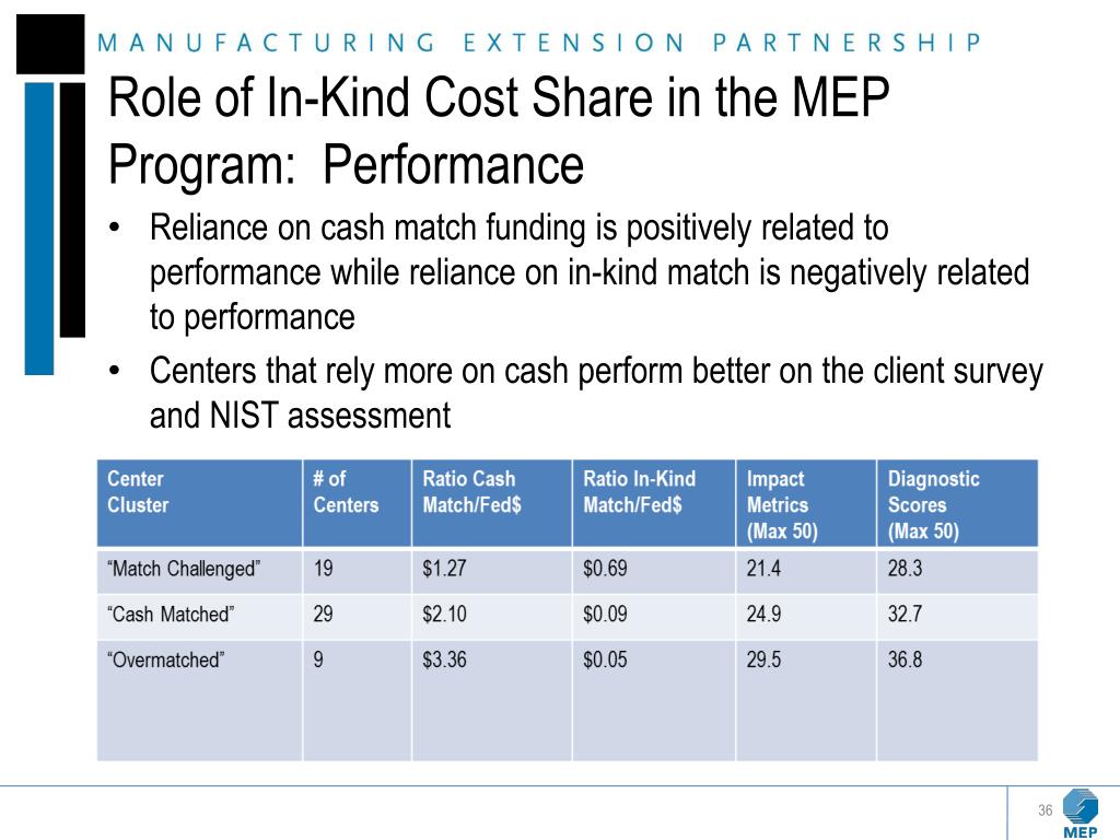 Role of In-Kind Cost Share in the MEP Program: Performance Reliance on cash match funding is positively related to performance while reliance on in-kind match is negatively related to performance Centers that rely more on cash perform better on the client survey and NIST assessment