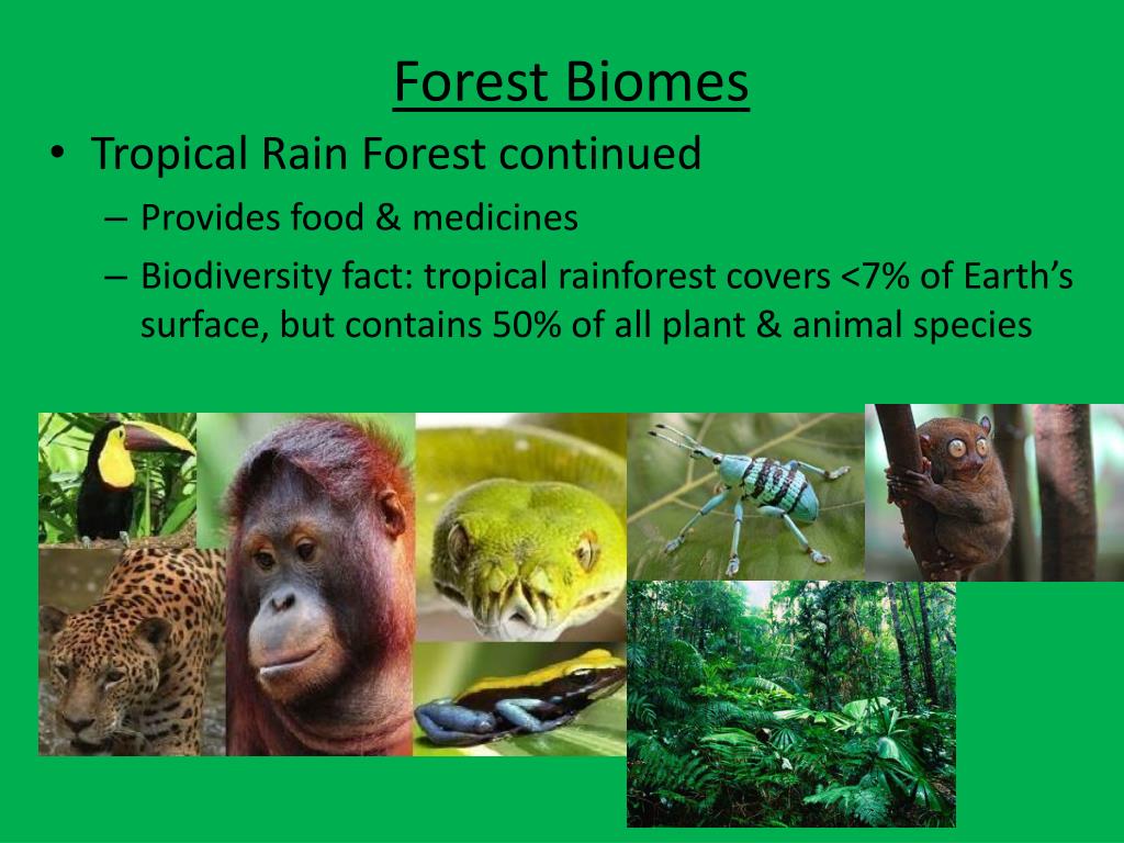 Forest Biomes • Tropical Rain Forest continued • Provides food & medicines • Biodiversity fact: tropical rainforest covers <7% of Earth’s surface, but contains 50% of all plant & animal species
