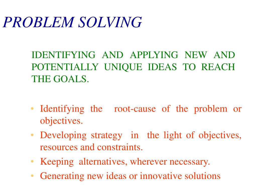 PROBLEM SOLVING IDENTIFYING AND APPLYING NEW AND POTENTIALLY UNIQUE IDEAS TO REACH THE GOALS. • Identifying the root-cause of the problem or objectives. • Developing strategy in the light of objectives, resources and constraints. • Keeping alternatives, wherever necessary. • Generating new ideas or innovative solutions