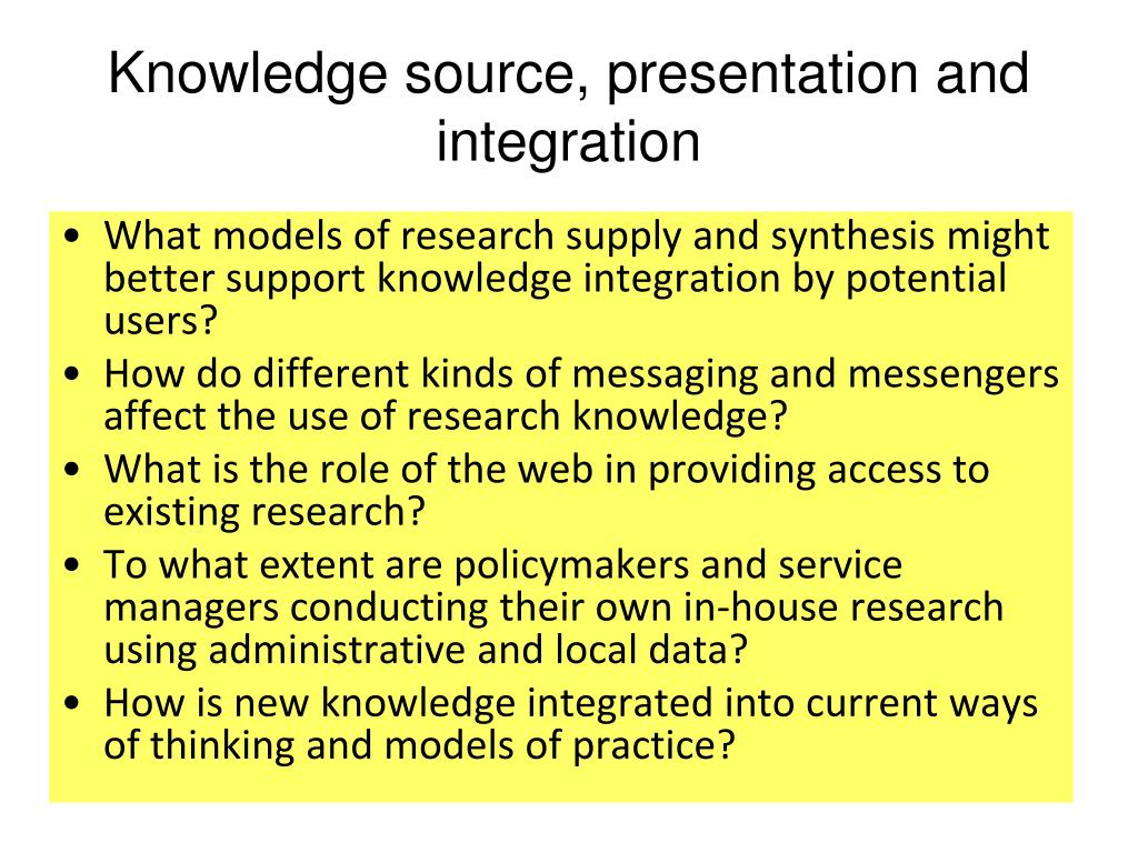 Knowledge source, presentation and integration • What models of research supply and synthesis might better support knowledge integration by potential users? • How do different kinds of messaging and messengers affect the use of research knowledge? • What is the role of the web in providing access to existing research? • To what extent are policymakers and service managers conducting their own in-house research using administrative and local data? • How is new knowledge integrated into current ways of thinking and models of practice?