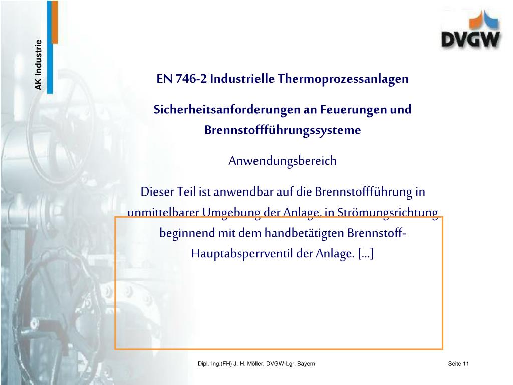 EN 746-2 Industrielle Thermoprozessanlagen Sicherheitsanforderungen an Feuerungen und Brennstoffführungssysteme Anwendungsbereich Dieser Teil ist anwendbar auf die Brennstoffführung in unmittelbarer Umgebung der Anlage, in Strömungsrichtung beginnend mit dem handbetätigten Brennstoff-Hauptabsperrventil der Anlage. [...] Dipl.-Ing.(FH) J.-H. Möller, DVGW-Lgr. Bayern