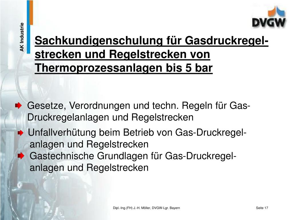 Gesetze, Verordnungen und techn. Regeln für Gas-Druckregelanlagen und Regelstrecken Sachkundigenschulung für Gasdruckregel-strecken und Regelstrecken von Thermoprozessanlagen bis 5 bar • Unfallverhütung beim Betrieb von Gas-Druckregel- anlagen und Regelstrecken • Gastechnische Grundlagen für Gas-Druckregel- anlagen und Regelstrecken Dipl.-Ing.(FH) J.-H. Möller, DVGW-Lgr. Bayern
