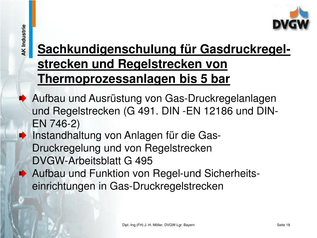 Aufbau und Ausrüstung von Gas-Druckregelanlagen und Regelstrecken (G 491. DIN -EN 12186 und DIN-EN 746-2) Sachkundigenschulung für Gasdruckregel-strecken und Regelstrecken von Thermoprozessanlagen bis 5 bar • Instandhaltung von Anlagen für die Gas- Druckregelung und von Regelstrecken • DVGW-Arbeitsblatt G 495 • Aufbau und Funktion von Regel-und Sicherheits- einrichtungen in Gas-Druckregelstrecken Dipl.-Ing.(FH) J.-H. Möller, DVGW-Lgr. Bayern