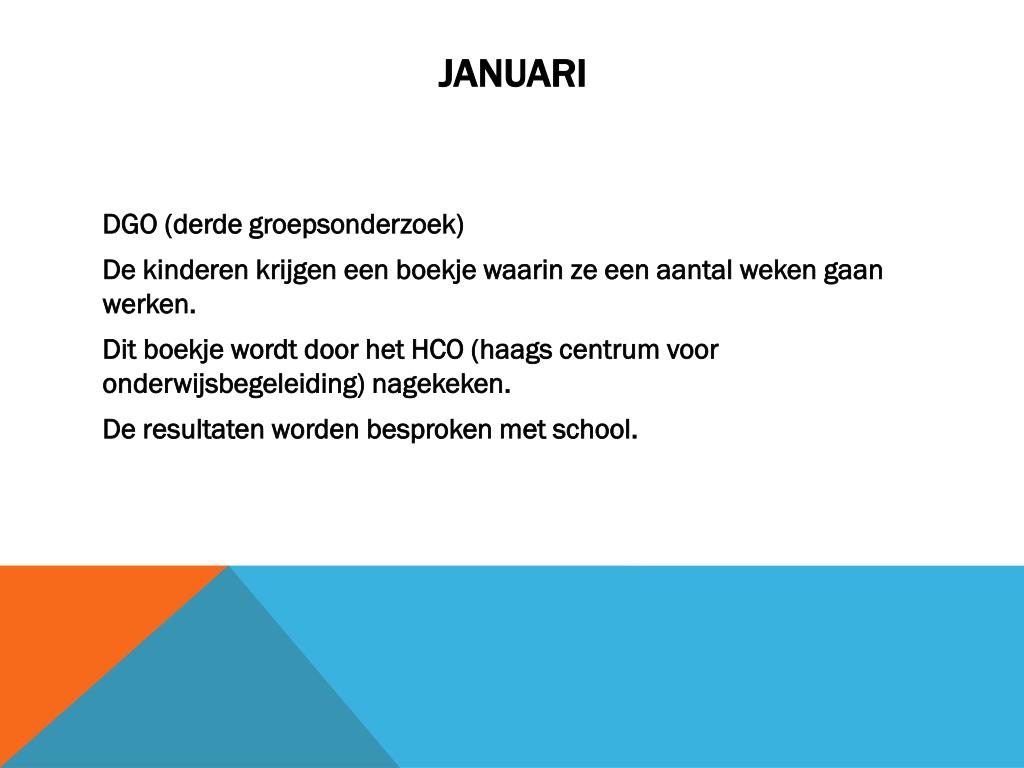 Januari DGO (derde groepsonderzoek) De kinderen krijgen een boekje waarin ze een aantal weken gaan werken. Dit boekje wordt door het HCO (haags centrum voor onderwijsbegeleiding) nagekeken. De resultaten worden besproken met school.