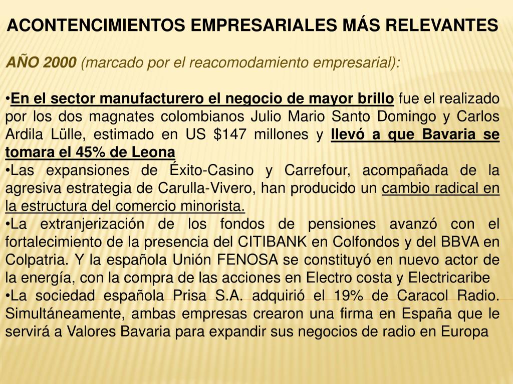 ACONTENCIMIENTOS EMPRESARIALES MÁS RELEVANTES • AÑO 2000 (marcado por el reacomodamiento empresarial): • En el sector manufacturero el negocio de mayor brillo fue el realizado por los dos magnates colombianos Julio Mario Santo Domingo y Carlos ArdilaLülle, estimado en US $147 millones y llevó a que Bavaria se tomara el 45% de Leona • Las expansiones de Éxito-Casino y Carrefour, acompañada de la agresiva estrategia de Carulla-Vivero, han producido un cambio radical en la estructura del comercio minorista. • La extranjerización de los fondos de pensiones avanzó con el fortalecimiento de la presencia del CITIBANK en Colfondos y del BBVA en Colpatria. Y la española Unión FENOSA se constituyó en nuevo actor de la energía, con la compra de las acciones en Electro costa y Electricaribe • La sociedad española Prisa S.A. adquirió el 19% de Caracol Radio. Simultáneamente, ambas empresas crearon una firma en España que le servirá a Valores Bavaria para expandir sus negocios de radio en Europa