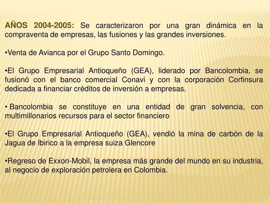 AÑOS 2004-2005: Se caracterizaron por una gran dinámica en la compraventa de empresas, las fusiones y las grandes inversiones. • Venta de Avianca por el Grupo Santo Domingo. • El Grupo Empresarial Antioqueño (GEA), liderado por Bancolombia, se fusionó con el banco comercial Conavi y con la corporación Corfinsura dedicada a financiar créditos de inversión a empresas. • Bancolombia se constituye en una entidad de gran solvencia, con multimillonarios recursos para el sector financiero • El Grupo Empresarial Antioqueño (GEA), vendió la mina de carbón de la Jagua de Ibirico a la empresa suiza Glencore • Regreso de Exxon-Mobil, la empresa más grande del mundo en su industria, al negocio de exploración petrolera en Colombia.