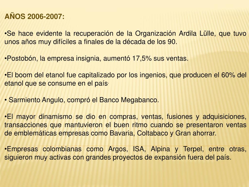 AÑOS 2006-2007: • Se hace evidente la recuperación de la Organización ArdilaLülle, que tuvo unos años muy difíciles a finales de la década de los 90. • Postobón, la empresa insignia, aumentó 17,5% sus ventas. • El boom del etanol fue capitalizado por los ingenios, que producen el 60% del etanol que se consume en el país. • Sarmiento Angulo, compró el Banco Megabanco. • El mayor dinamismo se dio en compras, ventas, fusiones y adquisiciones, transacciones que mantuvieron el buen ritmo cuando se presentaron ventas de emblemáticas empresas como Bavaria, Coltabaco y Gran ahorrar. • Empresas colombianas como Argos, ISA, Alpina y Terpel, entre otras, siguieron muy activas con grandes proyectos de expansión fuera del país.