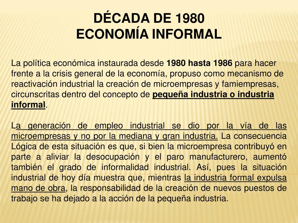 DÉCADA DE 1980 ECONOMÍA INFORMAL La política económica instaurada desde 1980 hasta 1986 para hacer frente a la crisis general de la economía, propuso como mecanismo de reactivación industrial la creación de microempresas y famiempresas, circunscritas dentro del concepto de pequeña industria o industria informal. La generación de empleo industrial se dio por la vía de las microempresas y no por la mediana y gran industria. La consecuencia Lógica de esta situación es que, si bien la microempresa contribuyó en parte a aliviar la desocupación y el paro manufacturero, aumentó también el grado de informalidad industrial. Así, pues la situación industrial de hoy día muestra que, mientras la industria formal expulsa mano de obra, la responsabilidad de la creación de nuevos puestos de trabajo se ha dejado a la acción de la pequeña industria.