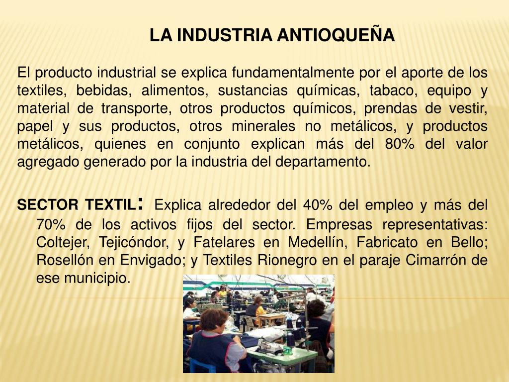 LA INDUSTRIA ANTIOQUEÑA El producto industrial se explica fundamentalmente por el aporte de los textiles, bebidas, alimentos, sustancias químicas, tabaco, equipo y material de transporte, otros productos químicos, prendas de vestir, papel y sus productos, otros minerales no metálicos, y productos metálicos, quienes en conjunto explican más del 80% del valor agregado generado por la industria del departamento. SECTOR TEXTIL:Explica alrededor del 40% del empleo y más del 70% de los activos fijos del sector. Empresas representativas: Coltejer, Tejicóndor, y Fatelares en Medellín, Fabricato en Bello; Rosellón en Envigado; y Textiles Rionegro en el paraje Cimarrón de ese municipio.