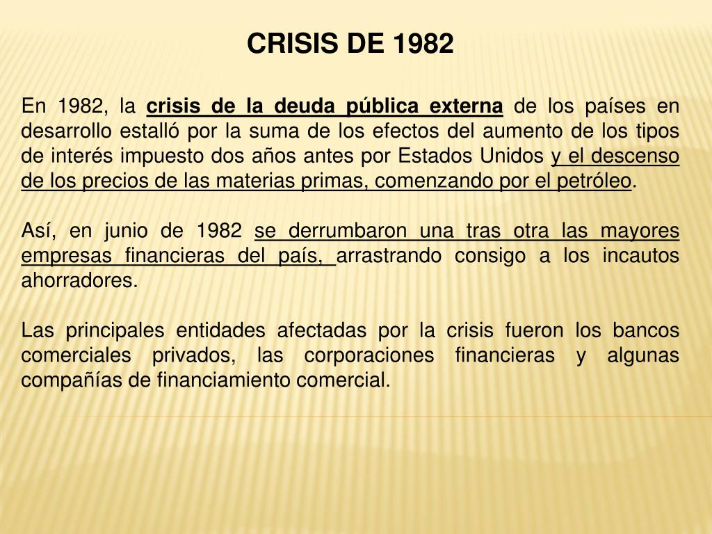 CRISIS DE 1982 En 1982, la crisis de la deuda pública externa de los países en desarrollo estalló por la suma de los efectos del aumento de los tipos de interés impuesto dos años antes por Estados Unidos y el descenso de los precios de las materias primas, comenzando por el petróleo. Así, en junio de 1982 se derrumbaron una tras otra las mayores empresas financieras del país, arrastrando consigo a los incautos ahorradores. Las principales entidades afectadas por la crisis fueron los bancos comerciales privados, las corporaciones financieras y algunas compañías de financiamiento comercial.