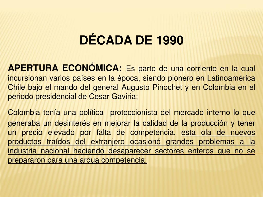 DÉCADA DE 1990 APERTURA ECONÓMICA: Es parte de una corriente en la cual incursionan varios países en la época, siendo pionero en Latinoamérica Chile bajo el mando del general Augusto Pinochet y en Colombia en el periodo presidencial de Cesar Gaviria; Colombia tenía una políticaproteccionista del mercado interno lo que generaba un desinterés en mejorar la calidad de la producción y tener un precio elevado por falta de competencia, esta ola de nuevos productos traídos del extranjero ocasionó grandes problemas a la industria nacional haciendo desaparecer sectores enteros que no se prepararon para una ardua competencia.