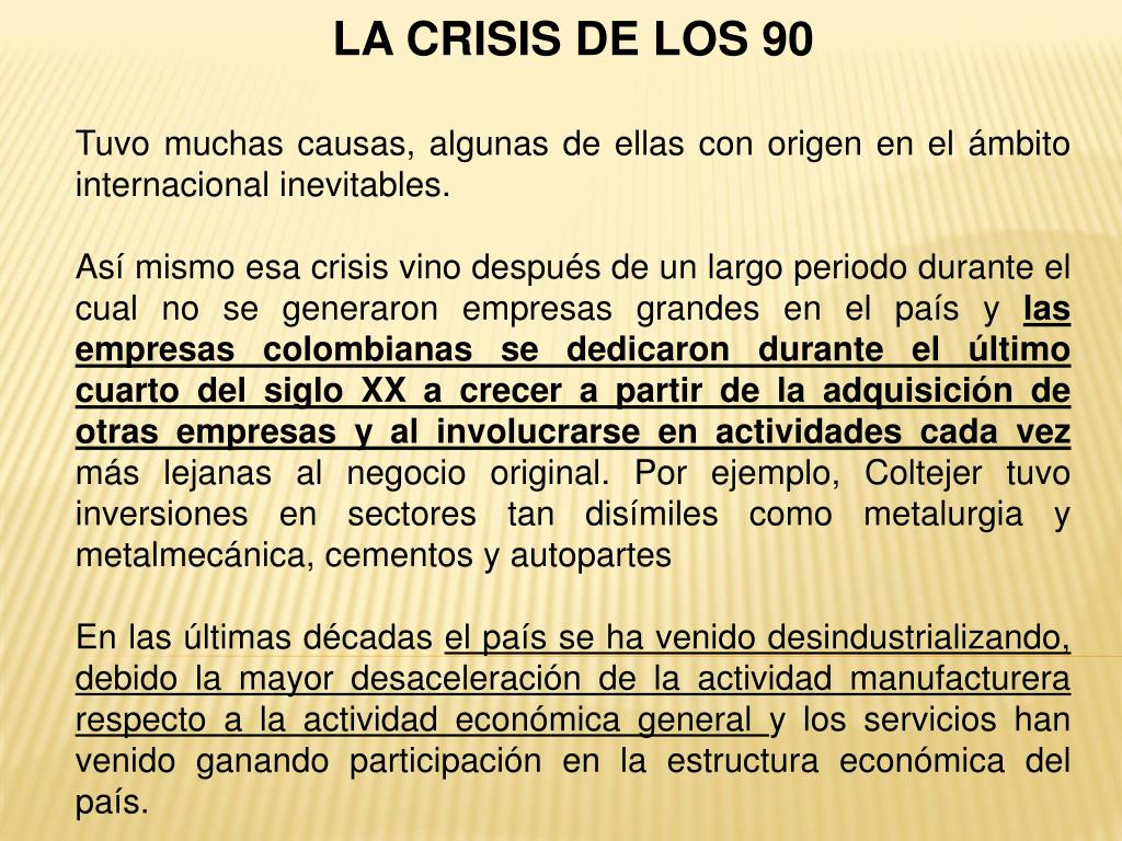 LA CRISIS DE LOS 90 Tuvo muchas causas, algunas de ellas con origen en el ámbito internacional inevitables. Así mismo esa crisis vino después de un largo periodo durante el cual no se generaron empresas grandes en el país y las empresas colombianas se dedicaron durante el último cuarto del siglo XX a crecer a partir de la adquisición de otras empresas y al involucrarse en actividades cada vez más lejanas al negocio original. Por ejemplo, Coltejer tuvo inversiones en sectores tan disímiles como metalurgia y metalmecánica, cementos y autopartes En las últimas décadas el país se ha venido desindustrializando, debido la mayor desaceleración de la actividad manufacturera respecto a la actividad económica general y los servicios han venido ganando participación en la estructura económica del país.