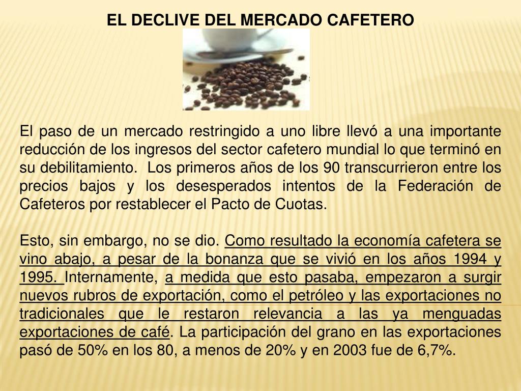 EL DECLIVE DEL MERCADO CAFETERO El paso de un mercado restringido a uno libre llevó a una importante reducción de los ingresos del sector cafetero mundial lo que terminó en su debilitamiento. Los primeros años de los 90 transcurrieron entre los precios bajos y los desesperados intentos de la Federación de Cafeteros por restablecer el Pacto de Cuotas. Esto, sin embargo, no se dio. Como resultado la economía cafetera se vino abajo, a pesar de la bonanza que se vivió en los años 1994 y 1995. Internamente, a medida que esto pasaba, empezaron a surgir nuevos rubros de exportación, como el petróleo y las exportaciones no tradicionales que le restaron relevancia a las ya menguadas exportaciones de café. La participación del grano en las exportaciones pasó de 50% en los 80, a menos de 20% y en 2003 fue de 6,7%.