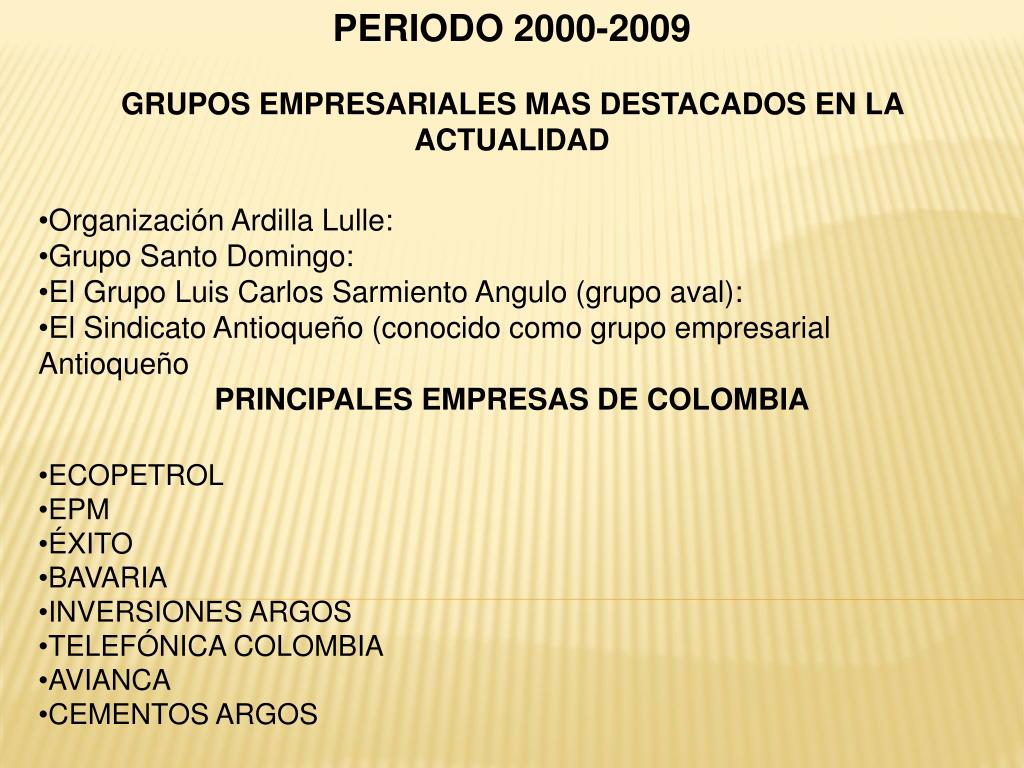 PERIODO 2000-2009 • GRUPOS EMPRESARIALES MAS DESTACADOS EN LA ACTUALIDAD • Organización Ardilla Lulle: • Grupo Santo Domingo: • El Grupo Luis Carlos Sarmiento Angulo (grupo aval): • El Sindicato Antioqueño (conocido como grupo empresarial Antioqueño • PRINCIPALES EMPRESAS DE COLOMBIA • ECOPETROL • EPM • ÉXITO • BAVARIA • INVERSIONES ARGOS • TELEFÓNICA COLOMBIA • AVIANCA • CEMENTOS ARGOS