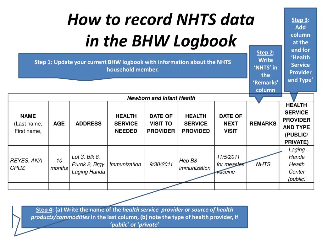 Step 3: Add column at the end for ‘Health Service Provider and Type’ How to record NHTS data in the BHW Logbook Step 2: Write ‘NHTS’ in the ‘Remarks’ column Step 1: Update your current BHW logbook with information about the NHTS household member. Step 4: (a) Write the name of the health service provider or source of health products/commodities in the last column, (b) note the type of health provider, if ‘public’ or ‘private’