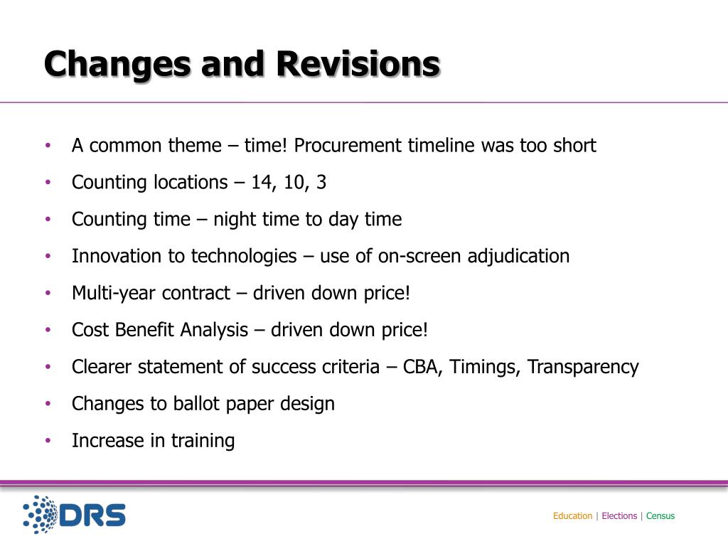 Changes and Revisions • A common theme – time! Procurement timeline was too short • Counting locations – 14, 10, 3 • Counting time – night time to day time • Innovation to technologies – use of on-screen adjudication • Multi-year contract – driven down price! • Cost Benefit Analysis – driven down price! • Clearer statement of success criteria – CBA, Timings, Transparency • Changes to ballot paper design • Increase in training