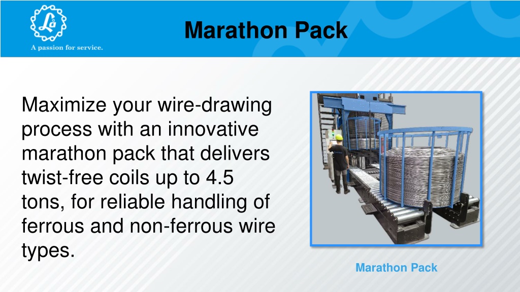 Marathon Pack Marathon Pack Maximize your wire-drawing process with an innovative marathon pack that delivers twist-free coils up to 4.5 tons, for reliable handling of ferrous and non-ferrous wire types.