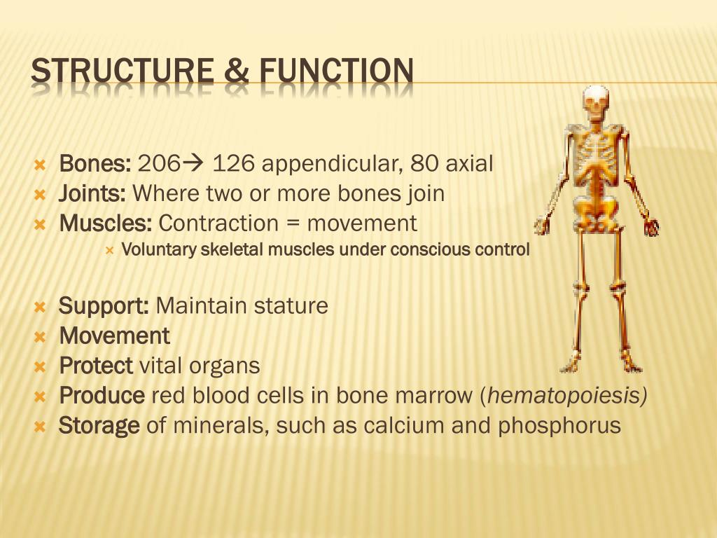 Bones: 206 126 appendicular, 80 axial • Joints: Where two or more bones join • Muscles: Contraction = movement • Voluntary skeletal muscles under conscious control • Support: Maintain stature • Movement • Protect vital organs • Produce red blood cells in bone marrow (hematopoiesis) • Storage of minerals, such as calcium and phosphorus Structure & Function