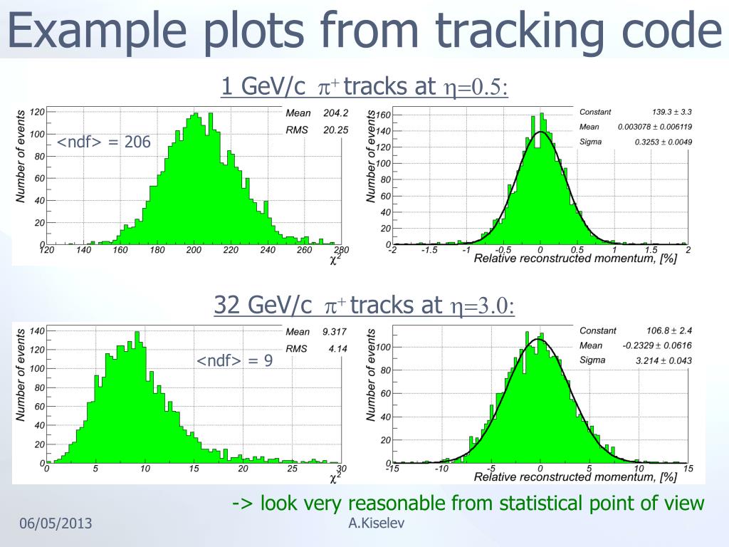 Example plots from tracking code 1 GeV/c p+ tracks at h=0.5: <ndf> = 206 32 GeV/c p+ tracks at h=3.0: <ndf> = 9 -> look very reasonable from statistical point of view A.Kiselev