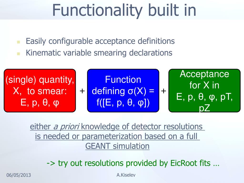 Functionality built in • Easily configurable acceptance definitions • Kinematic variable smearing declarations (single) quantity, X, to smear: E, p, θ, φ Function defining σ(X) = f([E, p, θ, φ]) Acceptance for X in E, p, θ, φ, pT, pZ + + either a priori knowledge of detector resolutions is needed or parameterization based on a full GEANT simulation -> try out resolutions provided by EicRoot fits … A.Kiselev