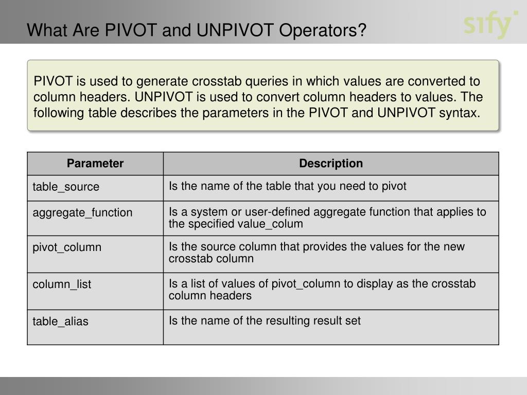 What Are PIVOT and UNPIVOT Operators? PIVOT is used to generate crosstab queries in which values are converted to column headers. UNPIVOT is used to convert column headers to values. The following table describes the parameters in the PIVOT and UNPIVOT syntax.