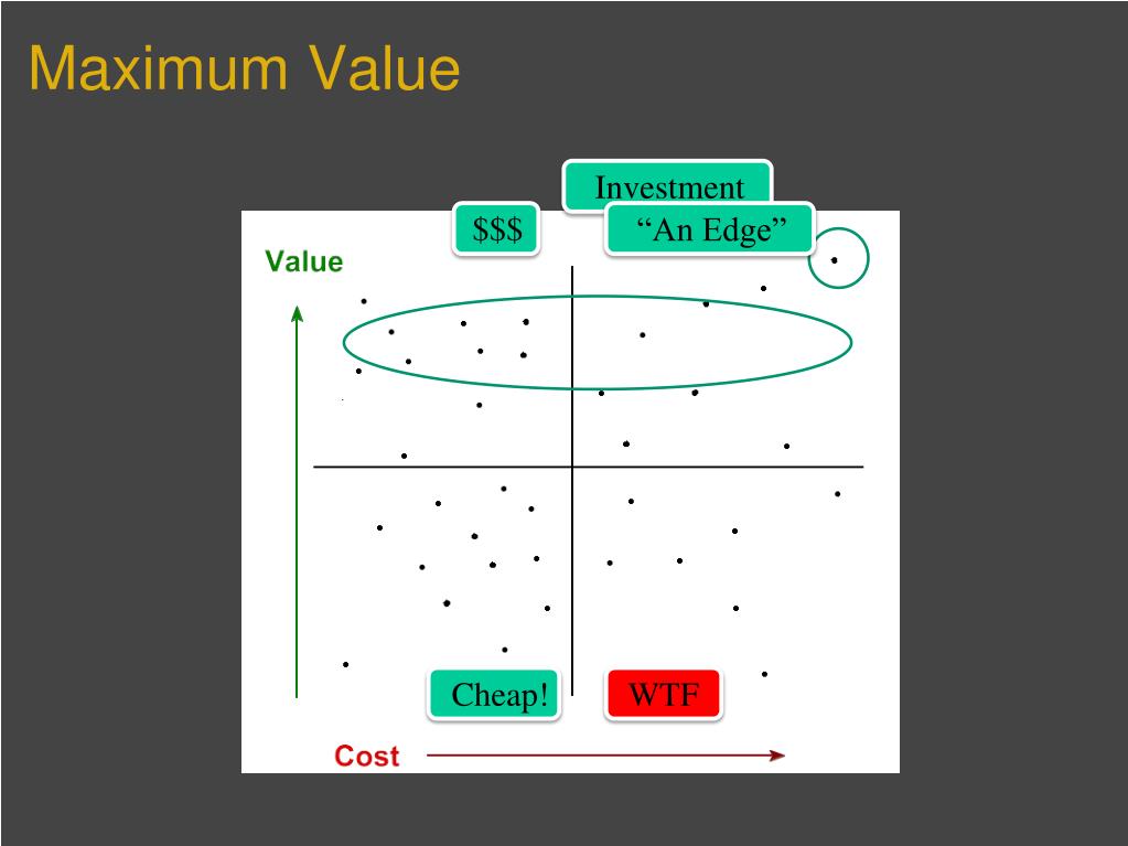 How it was Rigged Card Values and Costs are selected completely independently • The only correlation is that there are no excellent value cards with a less than a day estimate. Cost estimates are 100% accurate Value estimates have a 25% chance of being "wrong“ • Wrong is defined as off by a factor of 2, which may or may not actually cause a card to be miscategorized. • In particular, that’s more likely to throw off telling whether a given card is “low” or “some” value, and not likely to misfile an excellent – which matches real world.