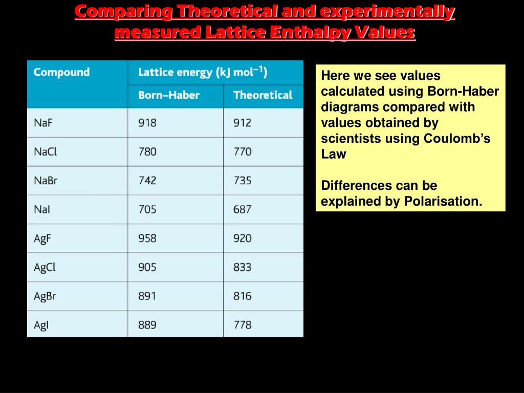 Comparing Theoretical and experimentally measured Lattice Enthalpy Values Here we see values calculated using Born-Haber diagrams compared with values obtained by scientists using Coulomb’s Law Differences can be explained by Polarisation.