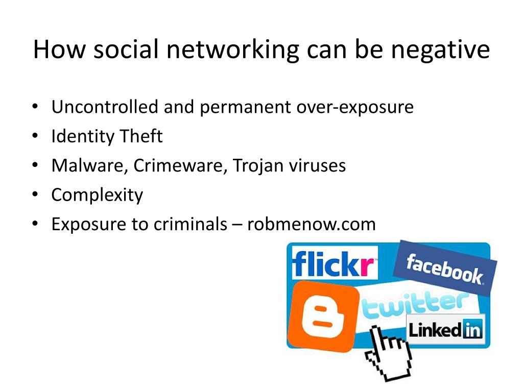 How social networking can be negative • Uncontrolled and permanent over-exposure • Identity Theft • Malware, Crimeware, Trojan viruses • Complexity • Exposure to criminals – robmenow.com