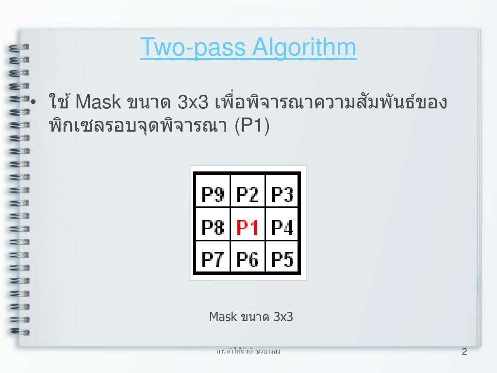Two-pass Algorithm • ใช้ Mask ขนาด 3x3 เพื่อพิจารณาความสัมพันธ์ของพิกเซลรอบจุดพิจารณา (P1) Mask ขนาด 3x3 การทำให้ตัวอักษรบางลง