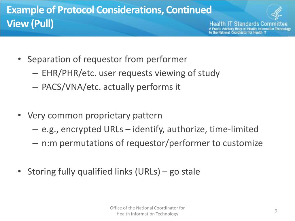 Example of Protocol Considerations, ContinuedView (Pull) • Separation of requestor from performer • EHR/PHR/etc. user requests viewing of study • PACS/VNA/etc. actually performs it • Very common proprietary pattern • e.g., encrypted URLs – identify, authorize, time-limited • n:m permutations of requestor/performer to customize • Storing fully qualified links (URLs) – go stale Office of the National Coordinator for Health Information Technology