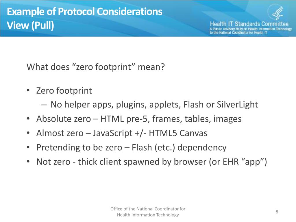 Example of Protocol Considerations View (Pull) What does “zero footprint” mean? • Zero footprint • No helper apps, plugins, applets, Flash or SilverLight • Absolute zero – HTML pre-5, frames, tables, images • Almost zero – JavaScript +/- HTML5 Canvas • Pretending to be zero – Flash (etc.) dependency • Not zero - thick client spawned by browser (or EHR “app”) Office of the National Coordinator for Health Information Technology