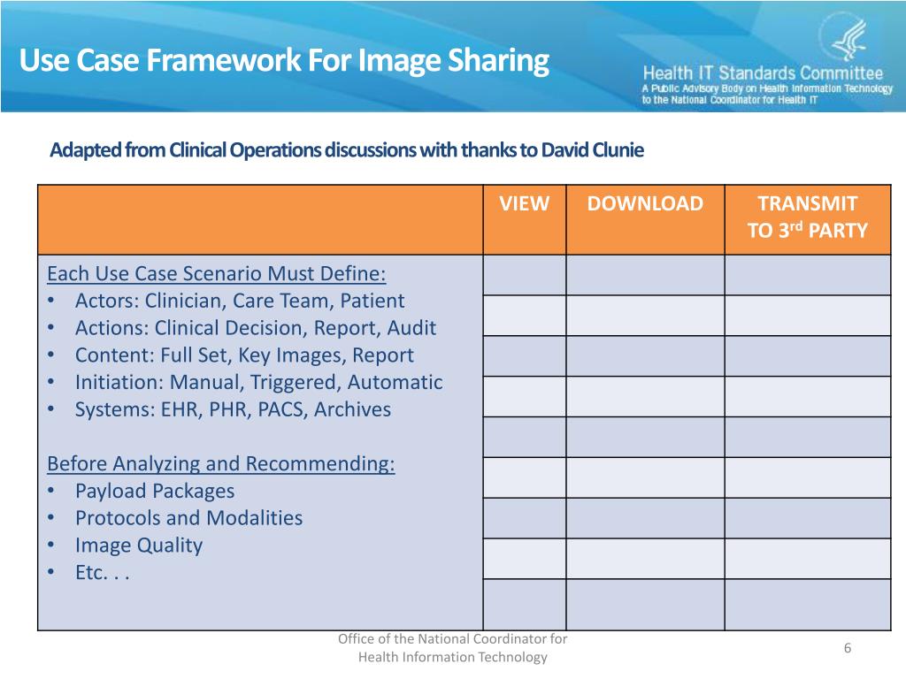 Use Case Framework For Image Sharing Adapted from Clinical Operations discussions with thanks to David Clunie Office of the National Coordinator for Health Information Technology