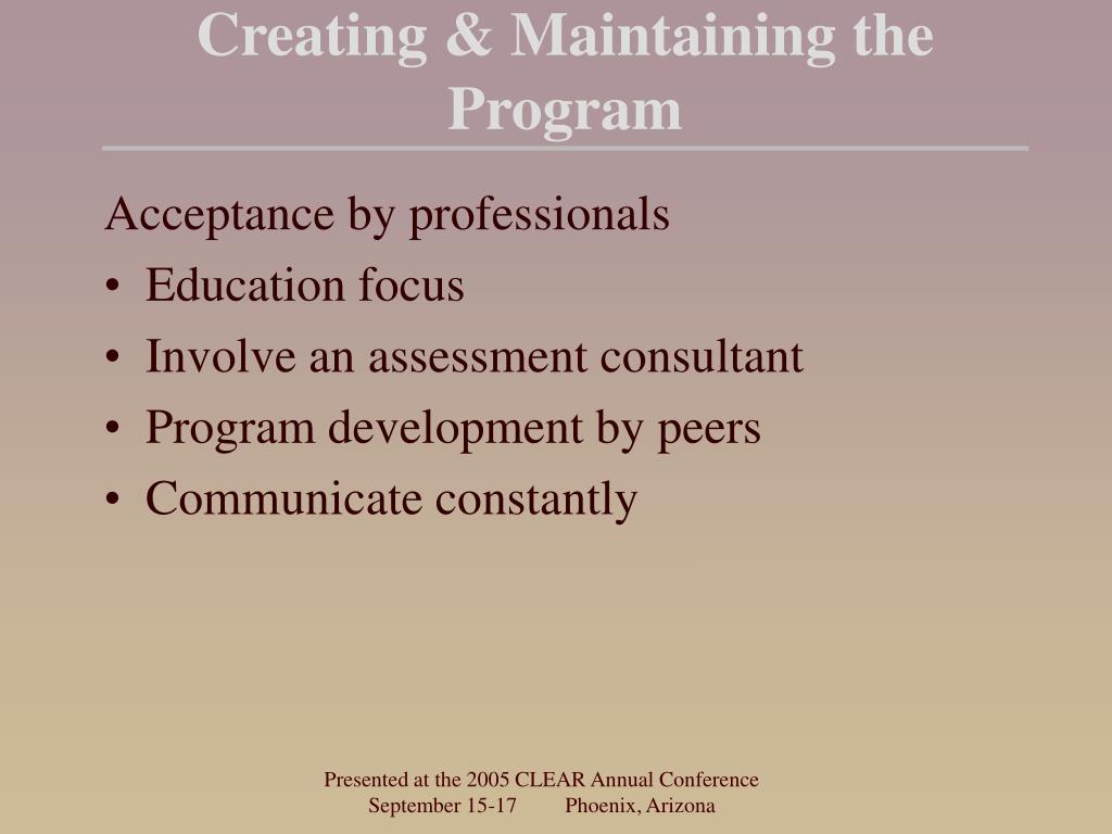 Creating & Maintaining the Program Acceptance by professionals • Education focus • Involve an assessment consultant • Program development by peers • Communicate constantly Presented at the 2005 CLEAR Annual Conference September 15-17 Phoenix, Arizona