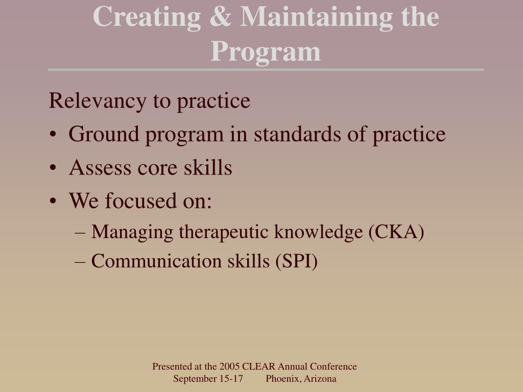 Creating & Maintaining the Program Relevancy to practice • Ground program in standards of practice • Assess core skills • We focused on: • Managing therapeutic knowledge (CKA) • Communication skills (SPI) Presented at the 2005 CLEAR Annual Conference September 15-17 Phoenix, Arizona