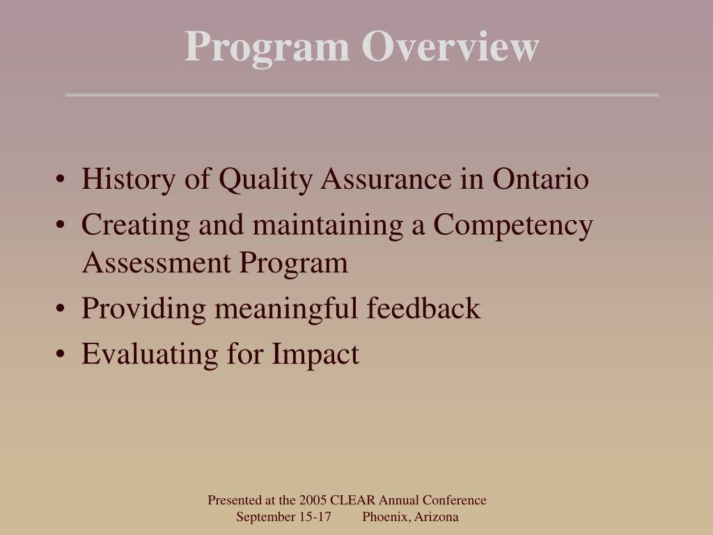 Program Overview • History of Quality Assurance in Ontario • Creating and maintaining a Competency Assessment Program • Providing meaningful feedback • Evaluating for Impact Presented at the 2005 CLEAR Annual Conference September 15-17 Phoenix, Arizona