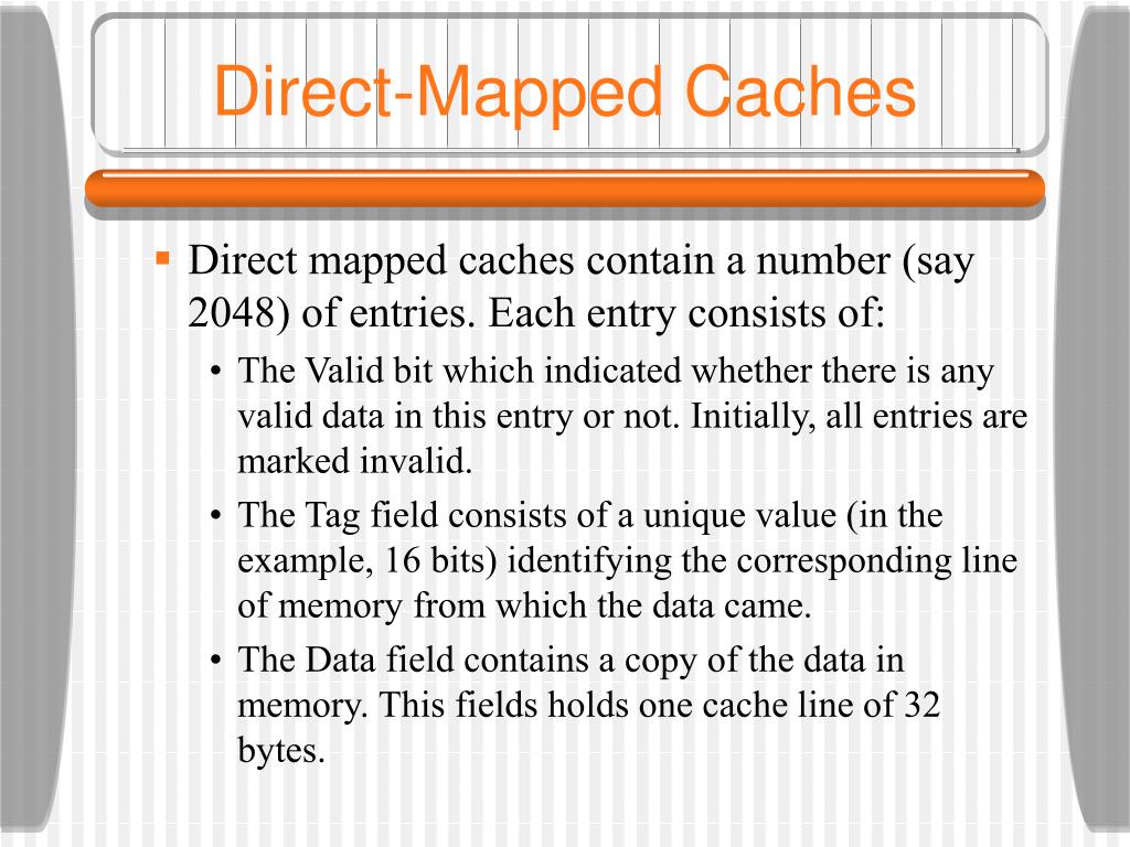 Direct-Mapped Caches • Direct mapped caches contain a number (say 2048) of entries. Each entry consists of: • The Valid bit which indicated whether there is any valid data in this entry or not. Initially, all entries are marked invalid. • The Tag field consists of a unique value (in the example, 16 bits) identifying the corresponding line of memory from which the data came. • The Data field contains a copy of the data in memory. This fields holds one cache line of 32 bytes.