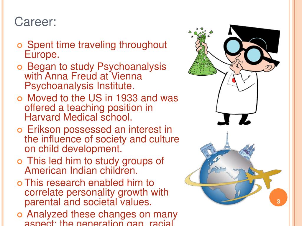 Background info: • Erikson was born in 1902 near Frankford, Germany. • Before Erikson was born, his Danish father had abandoned the family. • Raised by his young Jewish mother before she married a physician, Dr. Theodor Homberger. • The fact that Homberger was not his biological father was concealed from him for many years. • Left with feelings of confusion about who he really was, after learning about his father. • Interest in identity developed early on in life based upon his own experiences. 2