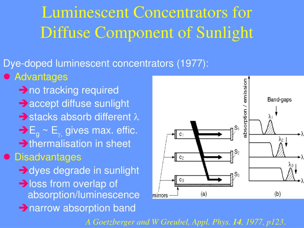 Luminescent Concentrators for Diffuse Component of Sunlight Dye-doped luminescent concentrators (1977): • Advantages • no tracking required • accept diffuse sunlight • stacks absorb different l • Eg ~ Eg, gives max. effic. • thermalisation in sheet • Disadvantages • dyes degrade in sunlight • loss from overlap of absorption/luminescence • narrow absorption band A Goetzberger and W Greubel, Appl. Phys. 14, 1977, p123.