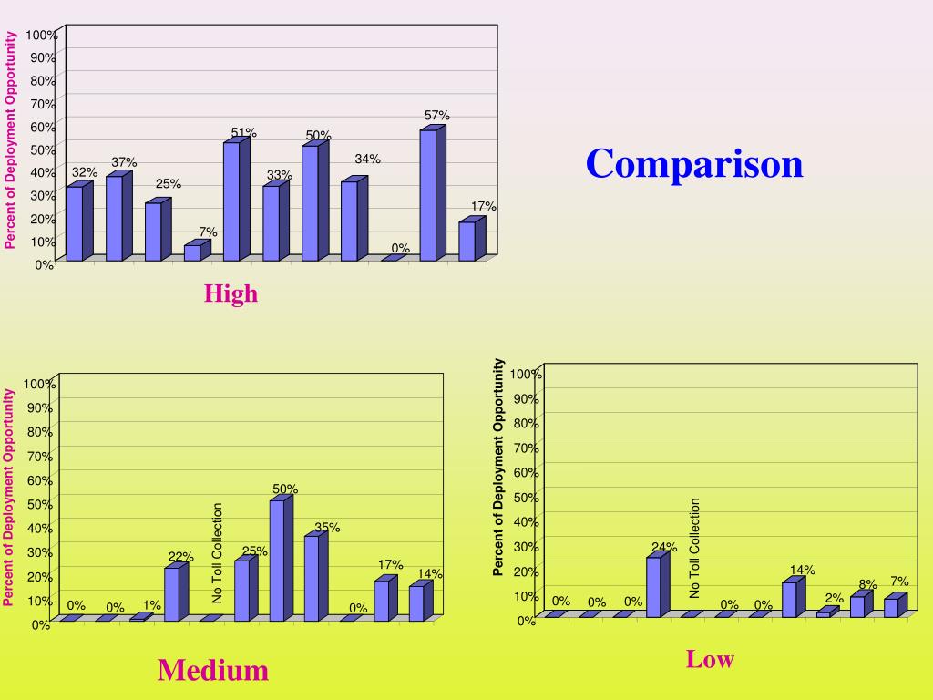 100% 90% 80% 70% 57% 60% 51% 50% 100% Percent of Deployment Opportunity 50% 90% 34% 37% 32% 40% 80% 33% 25% 70% 30% Percent of Deployment Opportunity 17% 60% 100% 20% 90% 50% 7% 80% 10% 40% 0% 70% 60% 0% 30% 24% No Toll Collection 50% Percent of Deployment Opportunity 50% 14% 20% 35% 40% 7% 8% 25% 30% No Toll Collection 10% 2% 22% 0% 0% 0% 17% 0% 0% 14% 20% 0% 10% 1% 0% 0% 0% 0% Comparison High Low Medium